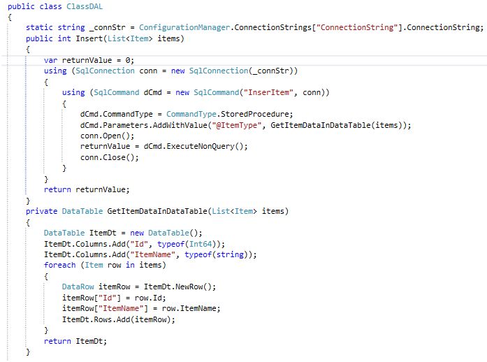 In this class file, we will convert the list to the data table. We must remember that data schema columns created in C# code must be in the same order of the table type created in SQL Server.
