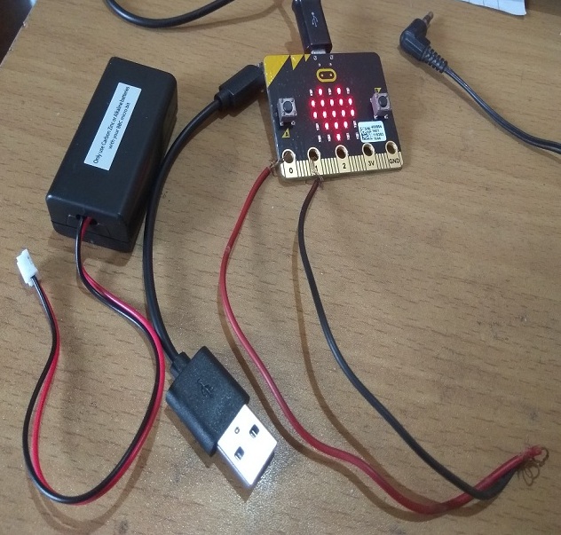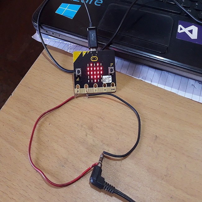 I had no crocodile connectors and I was very excited to see my micro:bit talking, so I used normal wires to make the connections. Anyway, this is the connection.