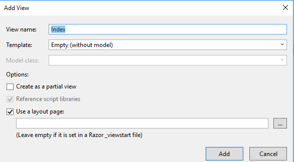 - Add a View named as “Index” and have a default template placed there.