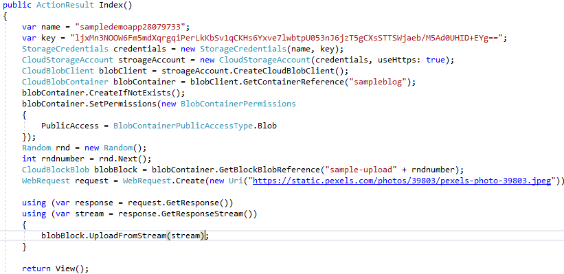 - Write the sample code to store the image into Blob container. For that, first extract the storage account name and the key to access the blob storages.