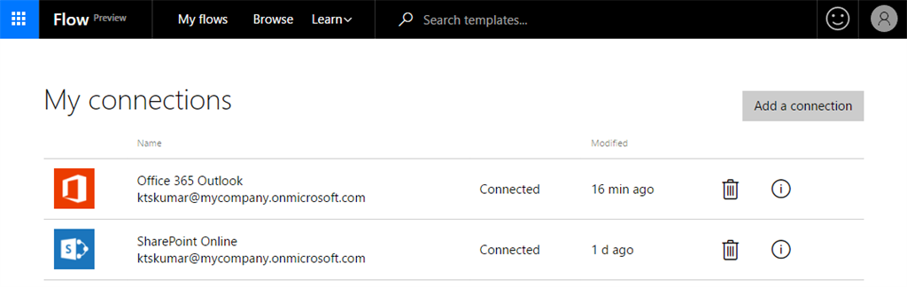 To connect the different services in Microsoft Flow, we should establish the connection to that appropriate service. And the connections can be managed from "My connections page". Below are the steps to manage the connections in Flow.