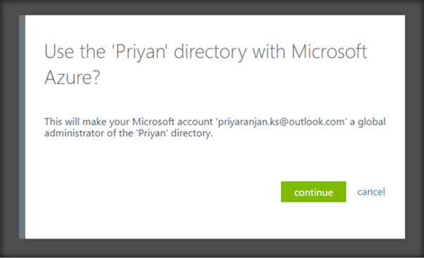 This time, you will be asked, if Office 365 Directory (in my case Priyan) can be used with Azure. If we click continue, Azure administrator will be made the global administrator for both Azure AD as well as Office 365 Directory. In this way, we can manage both directories in one place.