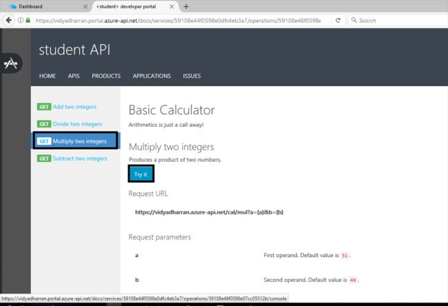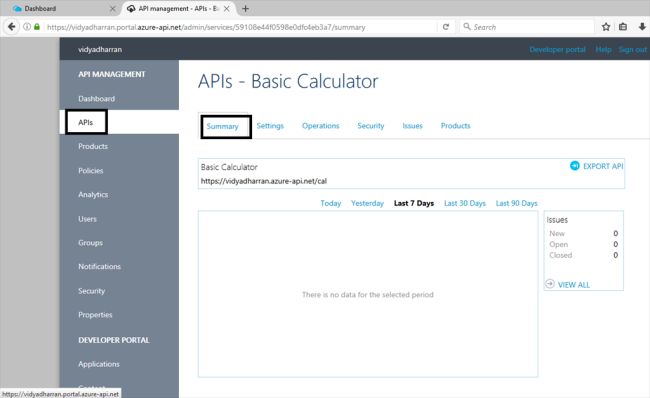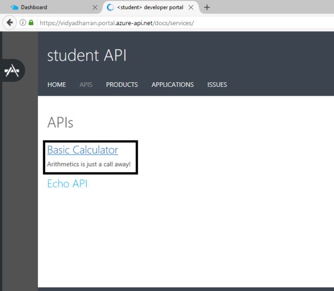 Click Developer portal and subsequently click APIs. Click APIs from menu and select the BASIC CALCULATOR for the available operations of it.