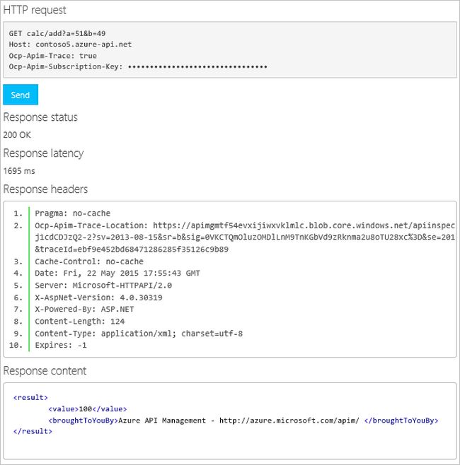The operation will be invoked and the developer displays in the portal; the response status and the response headers and the response content.
