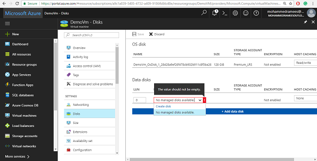 When you try to create one new, it will give an error message that you don’t have any managed disks available and an option to create one.