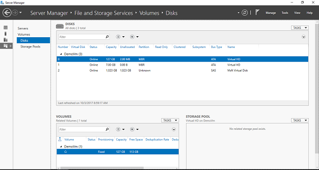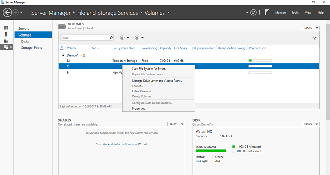 Start the virtual machine back and extend the volume from the server manager, then if you check the file explorer now you can see that the drive has scaled up.