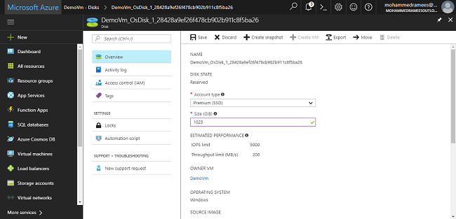 So, if you don’t want to pay, you have to stop from this dashboard not from the operating system and for scaling also we have to stop the server running from the portal itself. Once you stopped and selected the OS disk from the disk section you can see the option to scale up. Here I am scaling to 1023 GB and click on save.