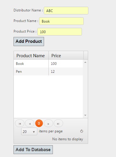 Write JavaScript code to add multiple records into Grid so that on submit button click, we can pass this list of products to Controller using Model.