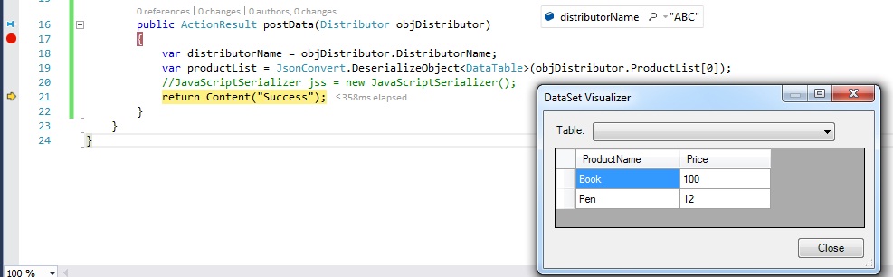- var productList = JsonConvert.DeserializeObject<DataTable>(objDistributor.ProductList[0]);