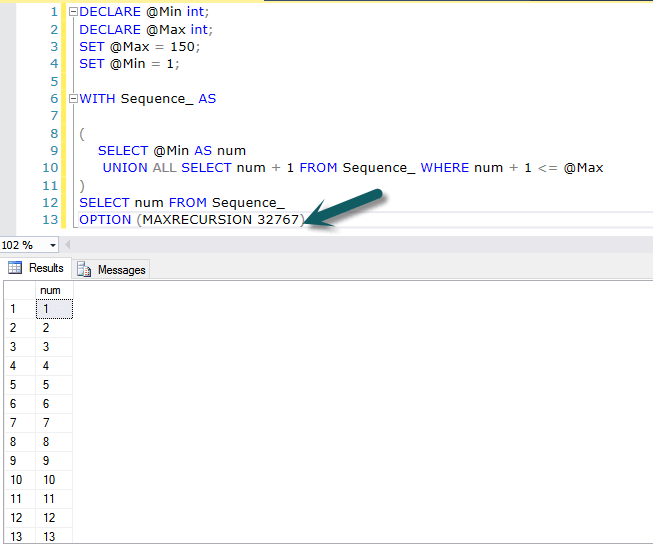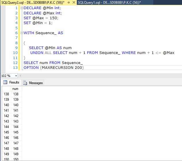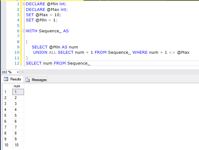 - WITH Sequence_ AS(SELECT @Min AS num UNION ALL SELECT num + 1 FROM Sequence_ WHERE num + 1 <= @Max)