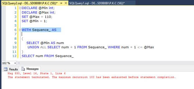 In the example above, we write a recursive query, which returns a number series from 1 to 10 and the number of the recursion is 9. Let’s try to increase the value of @Max from 10 to 110.