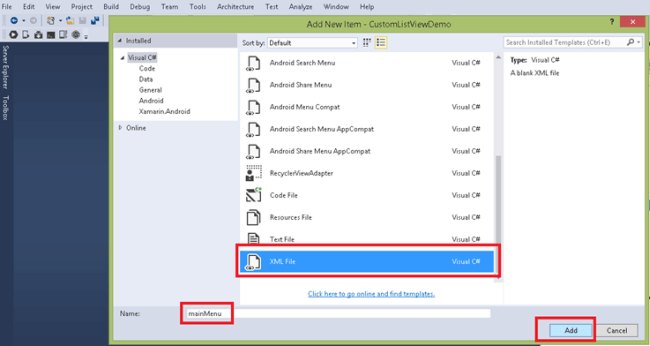 First, open the solution, add go to Resource, create menu folder and add new item as XML file. For the details, refer to the screenshot given below.