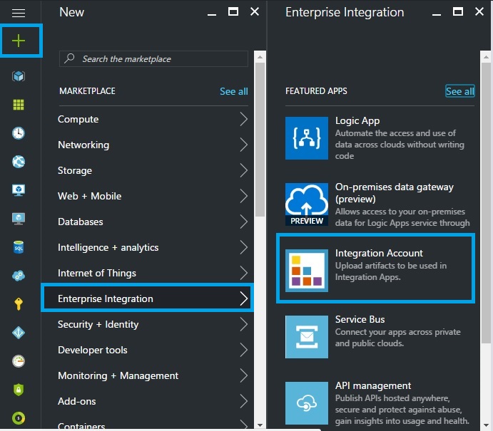 Sign in to the online Microsoft Azure portal, click “+NEW” and choose “Enterprise Integration”. Select “Integration Account”.