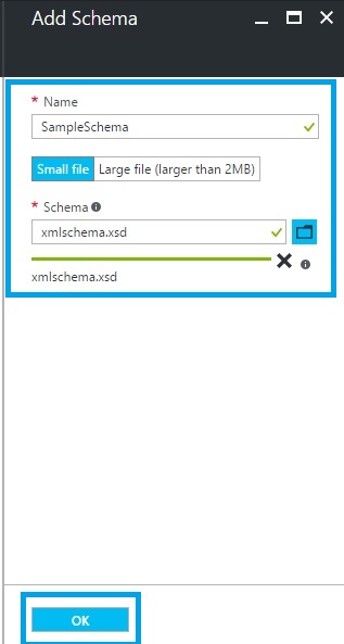 Now, we enter a name for our schema. Now, to upload the schema file, select the folder icon, which is next to the Schema text box. After the upload process is completed, select OK.
