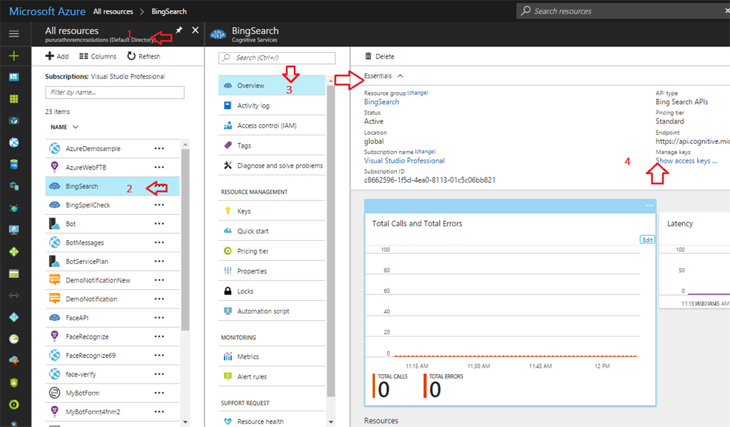 Now, click on "All Resources" in left panel and then find your service which you have recently created. Bing Search Panel will open and follow these steps which I have marked on the below screen.