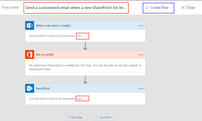 Let’s create flow to SharePoint list. As you see, there are certain steps to create flow.