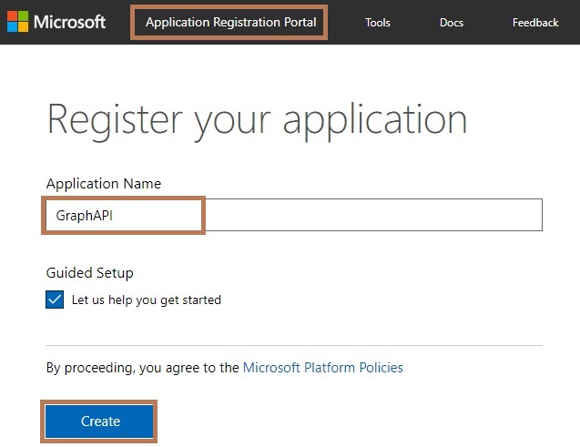 Click Here. Then, Login with your Outlook ID and give an application name followed by a click on "Create".