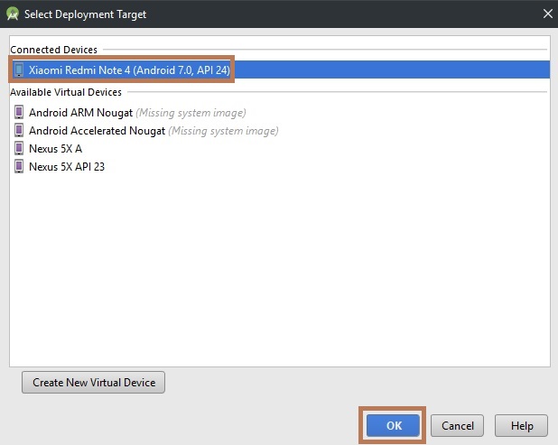 Next, go to Android Studio and Deploy the application. Select deployment target.