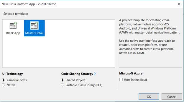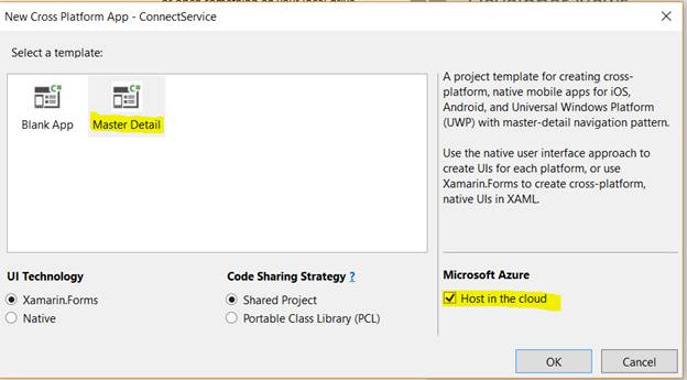 VS 2017 introduced new Cloud Xamarin template with online and offline storage. Just follow few steps given below to create Cloud storage app with iOS, Android and Windows 10 platform. The template includes tabbed navigation, MVVM, settings and more. You can follow the steps gived below for Host in Cloud.