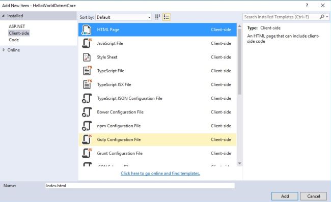 Right Click “wwwroot” and click Add -> New Item -> Click “Client-side” sub category and select HTML Page.
