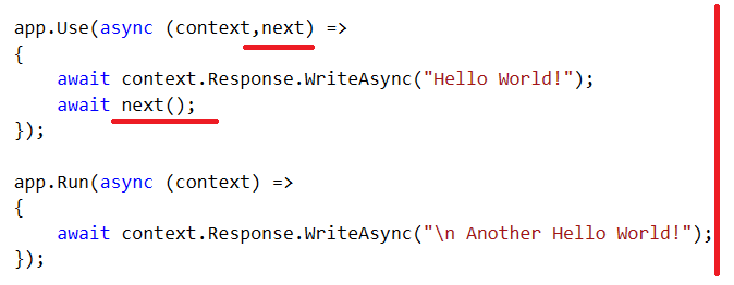 You can add a middleware component just by using another lambda expression inside app.Use() :