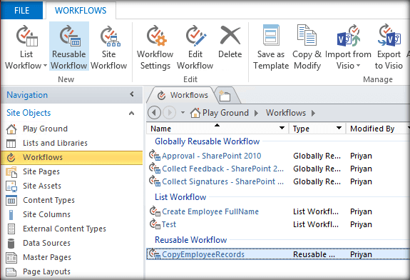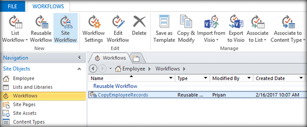 List Workflow is attached to a particular list and the logic will be executed upon that specific list. Thus, if we want to have the same Workflow logic attached to another list, we will have to recreate the Workflow for the new list. To overcome this issue, we have the reusable Workflow, where we can attach the Workflow to a content type. Hence, any lists that inherit the content type will have the Workflow also attached to it. In this way, we don’t have to recreate similar Workflows for the multiple lists. Another type of Workflow is the Site Workflow, which is attached to the specific site. Unlike List and Reusable Workflows, Site Workflows are not triggered in response to added/modified events. We have to manually trigger the site Workflows.