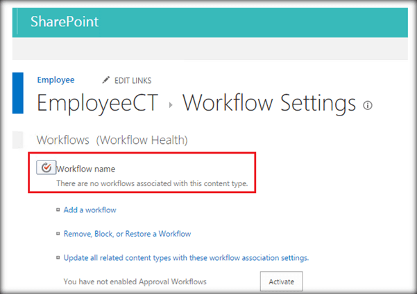 In some cases, even after activating the feature, the Workflow may not be available with the content type.