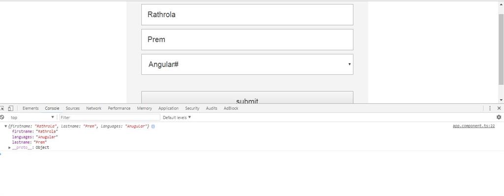 - <form class="container" #userForms="ngForm" (ngSubmit)="onsubmit(userForms.value)"> <input type="text" name="firstname" placeholder="FirstName" ngModel><br> <input type="text" name="lastname" placeholder="LastName" ngModel> <br> <select name="programming" ngModel>