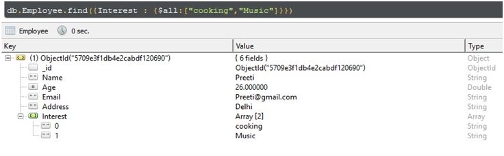 - db.Employee.find({Interest : {$all:["cooking","Music"]}})