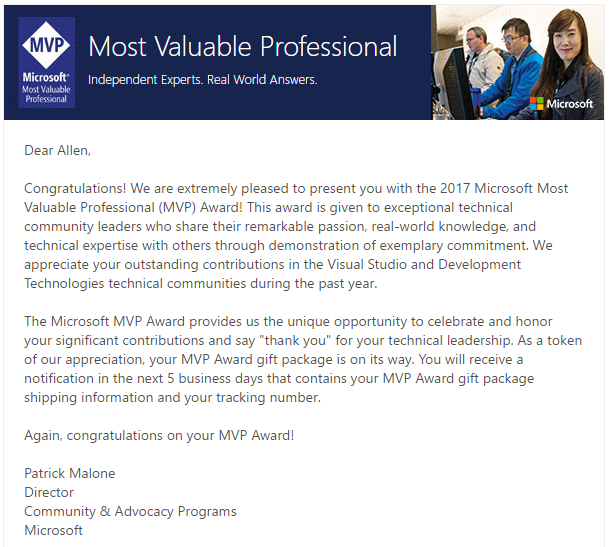 At the start of April, I received an email from Microsoft, which says I had been awarded their MVP (Most valued professional) award for 2017. This was the third award I have received under the title MVP, not just from Microsoft, but from the technical communities in which I am involved.