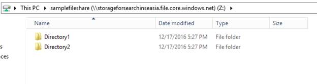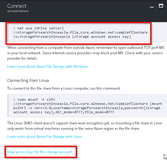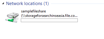 net use Z: \\<<Storage Name here>>.file.core.windows.net\samplefileshare /u:<<Storage Account Name here>> <<Access Key here>>