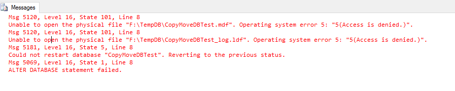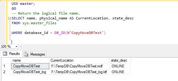 - FILENAME = 'F:\TempDB\CopyMoveDBTest.mdf');