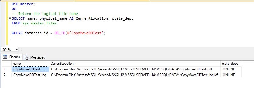 - SELECT name, physical_name AS CurrentLocation, state_desc