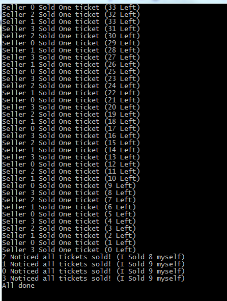 - Console.WriteLine("{0} Noticed all tickets sold! (I Sold {1} myself)", name, numSoldByThisThread);
