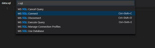 In the current state, we are in disconnected mode. If we write any query, we will not get any result. First, we will create a connection to SQL Server. Press “Ctrl+Shift+P” or F1 and type “sql”. You will get a dropdown list. From this list, click on “MS SQL: Connect” option and select “Create Connection Profile”.
