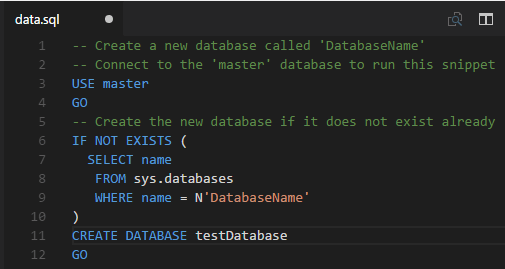 Click on “sqlCreateDatabase” option. When you enter on this, you will get a code snippet to create a database. Write “testDatabase” for this exercise.