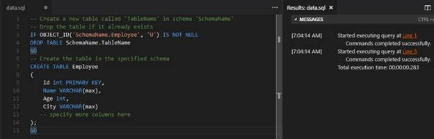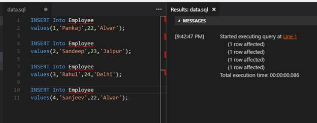 After writing all the column names and constraints, when you press “Ctrl+Shift+E”, an Employee table will be created. If you again press the “Ctrl+Shift+E”, then you will get an error that the table name already exists. Now, our table is ready. Let’s insert some values into Employee table.