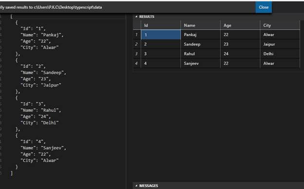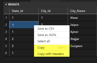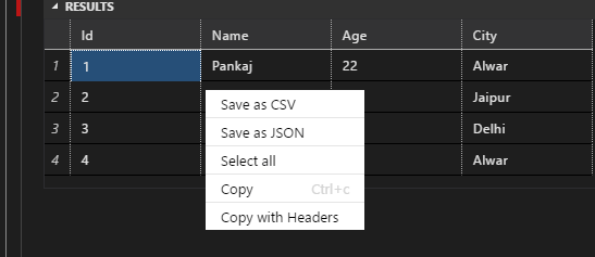 One of the great features of Visual Studio code is that we can save our table result into JSON and XML format. For this, right click on your table and select.