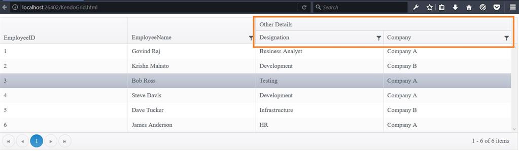 We can observe that the Multi Column header is achieved simply by making the sub columns with the common title. From the code given above, it is obvious that we have created a title - other details with the column fields Designation and Company
