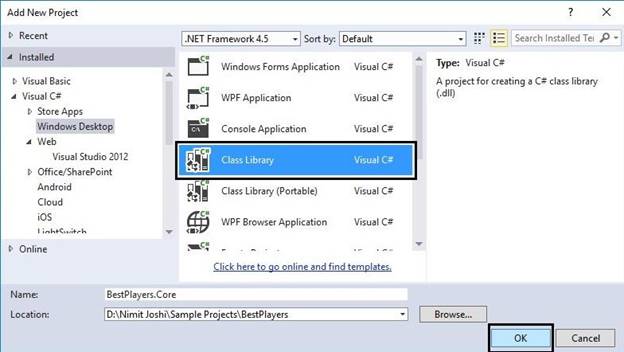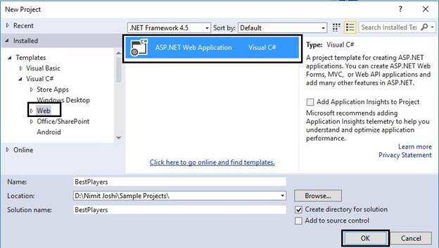 In the next wizard, select the “Web” from the left pane and select ASP.NET Web Application”. Enter the relative name of the project.