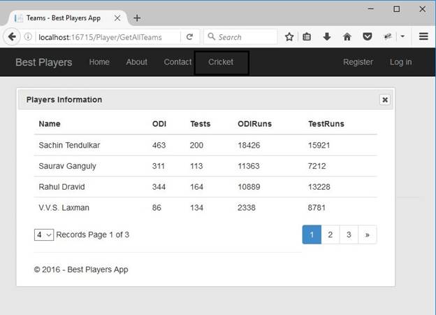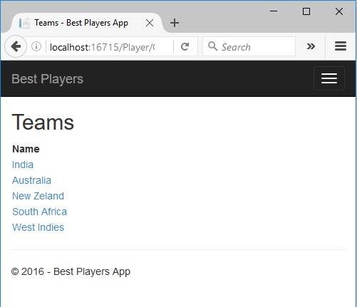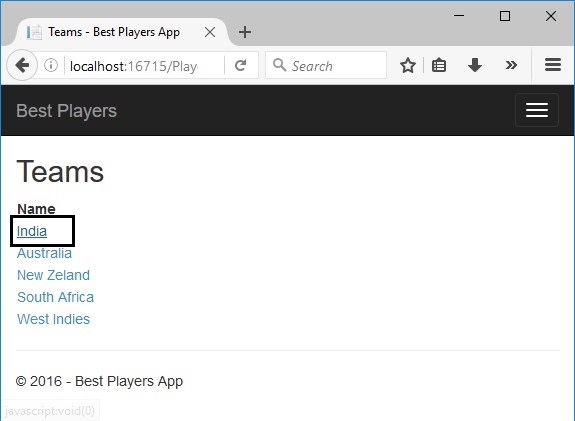 Build the Application and run the Application. Open the Cricketer page and click India.