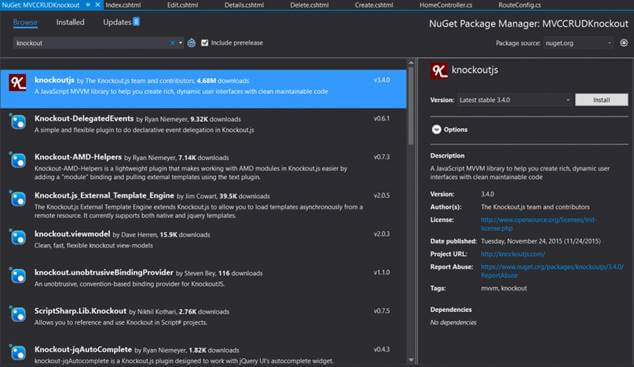 To install Knockout JS in your project, please right click on your project, click on Manage NuGet Package, and search for ‘Knockout’.