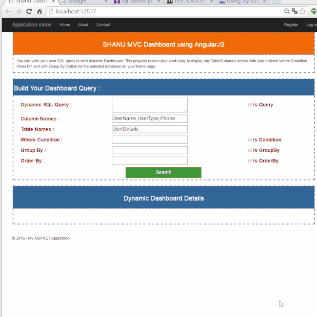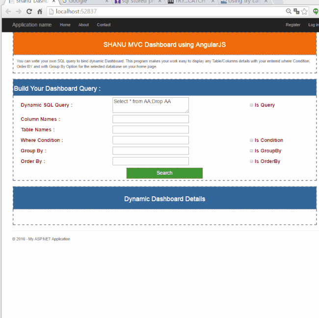 Here in this application we have option only to select and bind the data. If user entered any insert, drop, delete query, other than select query we will see the alert message as only select query can be used from this application. We have checked SQL Injection in each user input and display the error message to the user. We will see more in detail about this SQL injection checking in this article.