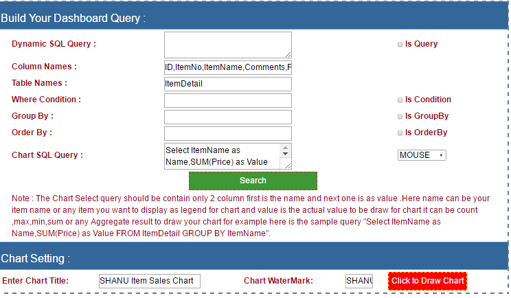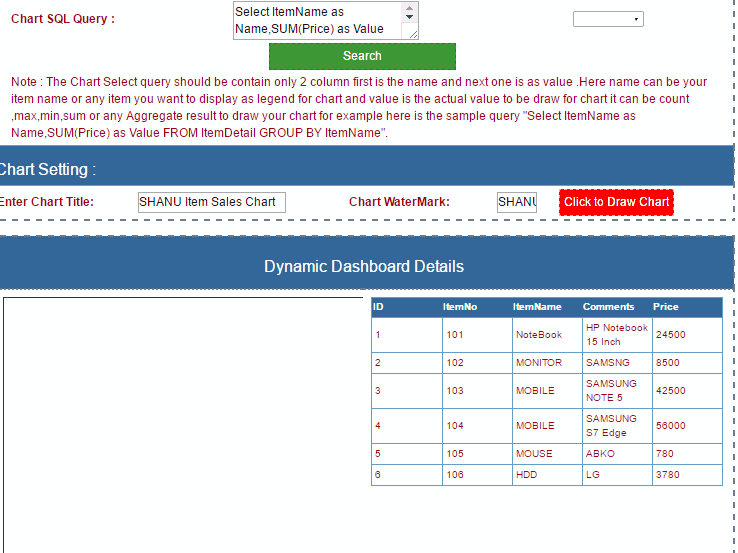 To draw a chart, we have fixed the standard -- as always display two columns, where one is the name and another one is the value. Here, the name is any name (Legend) to be displayed for a chart and a value is the actual value to draw the chart. In search button click, we first bind the chart item to the Combo box. We will be using this Combo box result to draw the chart.
