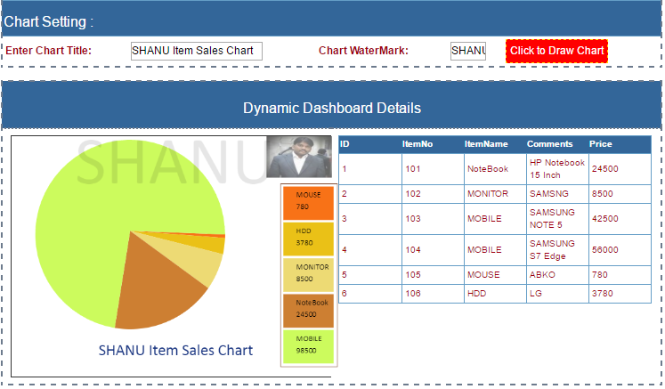 A user can add Chart Title and Watermark text, as per his requirement at the run time and click “Click to Draw Chart) button to draw your chart on the dashboard.