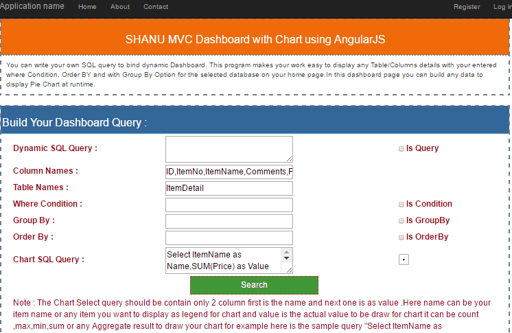 In this article, we will see in detail about how to create a Dynamic MVC dashboard with the chart and data display, using AngularJS and WEB API. Using this Web Application, you can write your own SQL query to bind the dynamic dashboard with the chart and data. This program makes your work easy in displaying any table/columns details with your entered where condition, order by, and group by options for the selected database on your home page with both the data and chart.