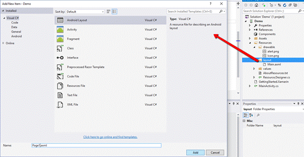 Now, go to your Solution Explorer. Right click on the layout folder and add new layout page, as shown below.