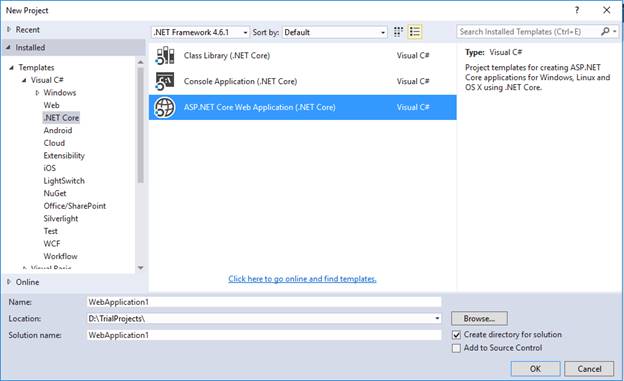 Open Visual Studio 2015 Go to menu click File> New> Project then choose .net Core from left menu by selecting ASP.NET Core Web Application like below image.