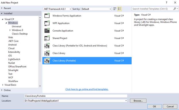 - Portable Class Library (PCL) – Works on targeted .NET platforms (.NET framework 4.5, ASP .NET core 1.1, Windows 8)