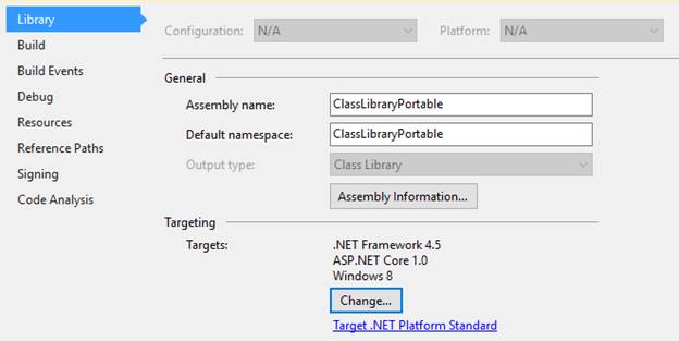 Go to properties of the portable class library we can see we have targeted the .Net Framework 4.5, ASP.NET Core 1.0, Windows 8
